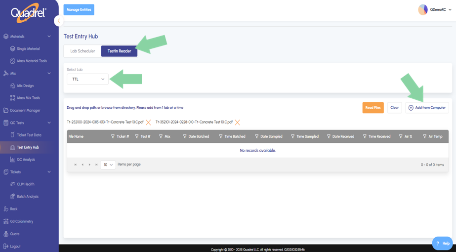 In Test Entry Hub, switch to the new TestIn Reader tab. Users can now select a lab and read in test data from a PDF file. Click the button, add from Computer or drag and drop to load in test data PDF files. In the example below, 2 test data files have been uploaded.