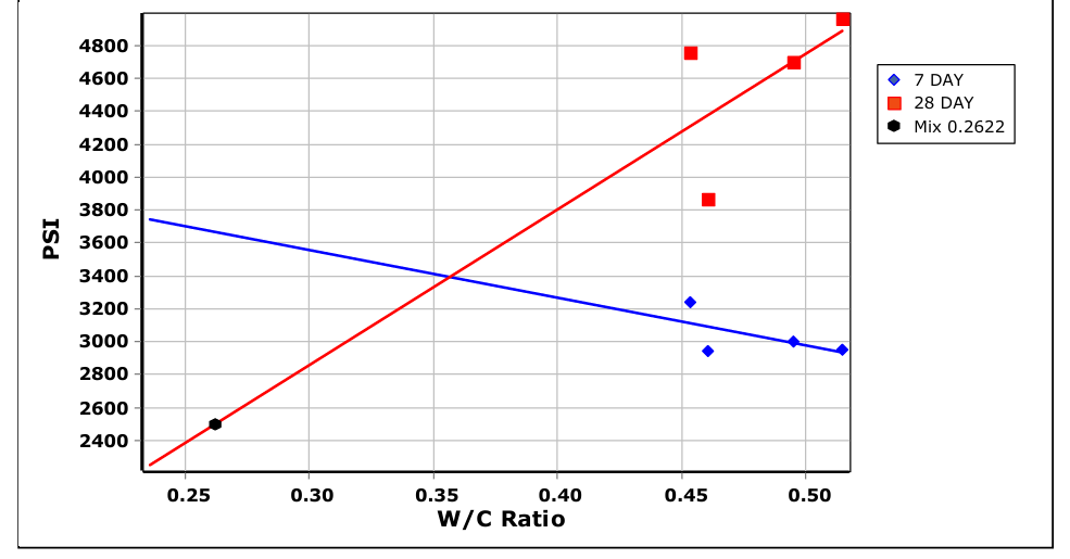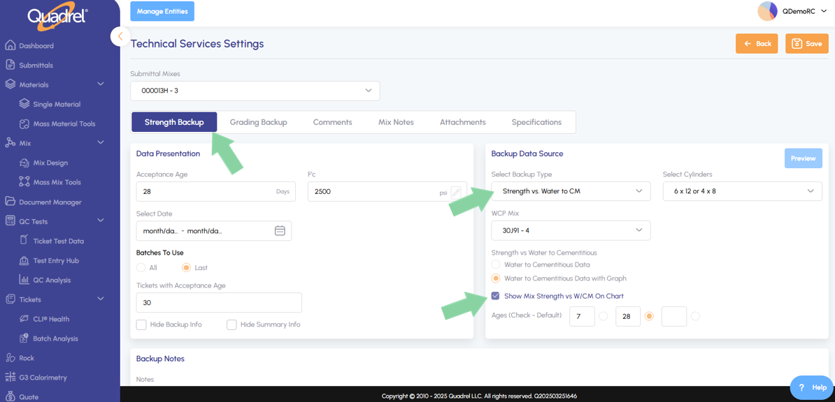 Technical service settings will load, and users can select the backup type "Strength vs. Water to CM" backup type, also known as the 3-point curve. The new feature is the checkbox "Show Mix Strength vs W/CM On Chart" to graph this data in submittal reports.