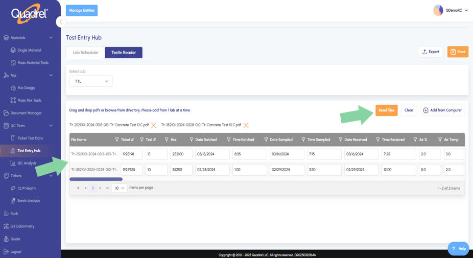 Once all test data files have uploaded, click the Read Files button to begin the automatic upload of test data into Quadrel. When the data is uploaded, review and click save when done.