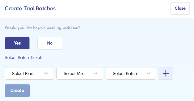 - To use existing batches, choose your plant and mix the batch belongs to, then select the batch to be used in the W/C Curve.
