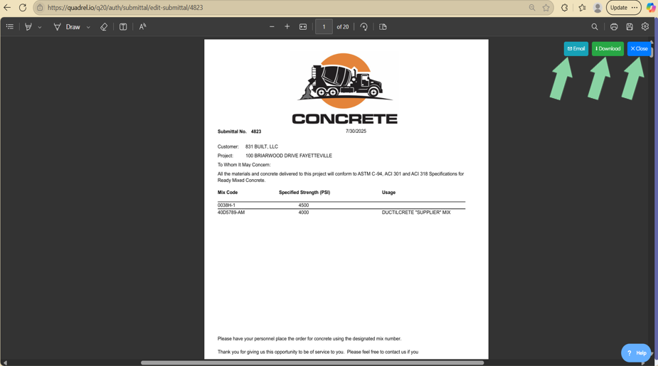 - Download - The download button will save the submittals PDF locally to the user's download folder.