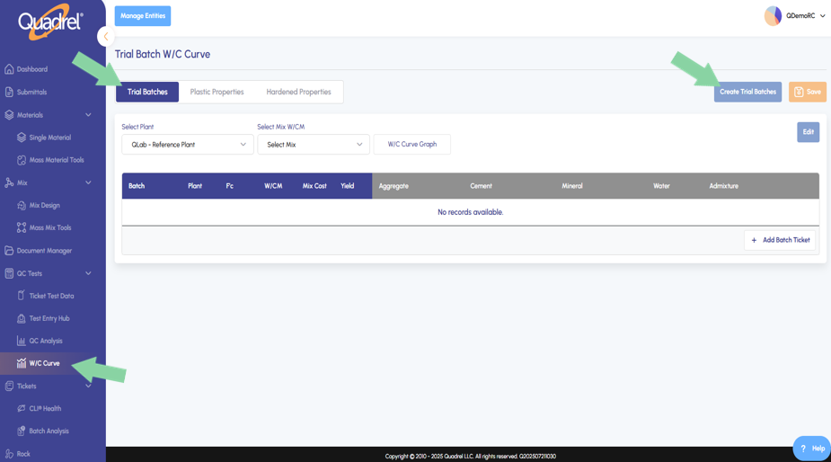 Visit the W/C Curve page and the Trial Batches tab will load by default. Click on Create Trial Batches to either create the curve from existing batches or to create new batches.