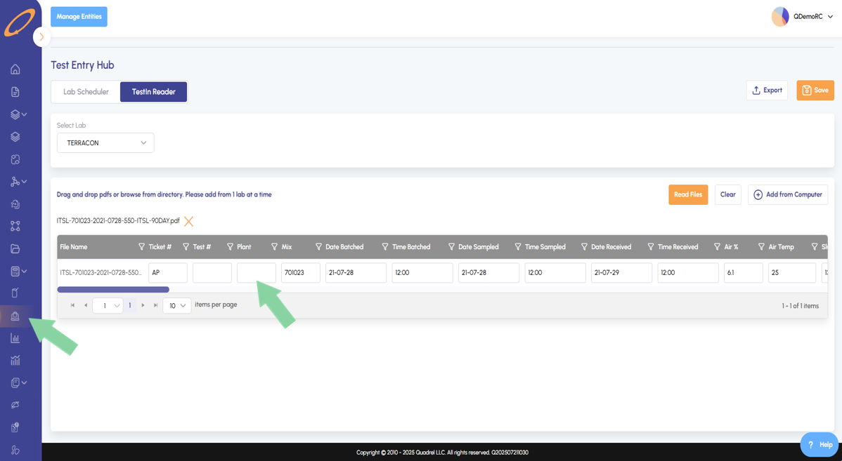 In Test Entry Hub, the TestIn Reader now has an additional table column for plant. This will allow those still onboarding to import test data without Quadrel iBatch pulling in tickets from the dispatch system.