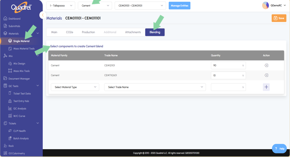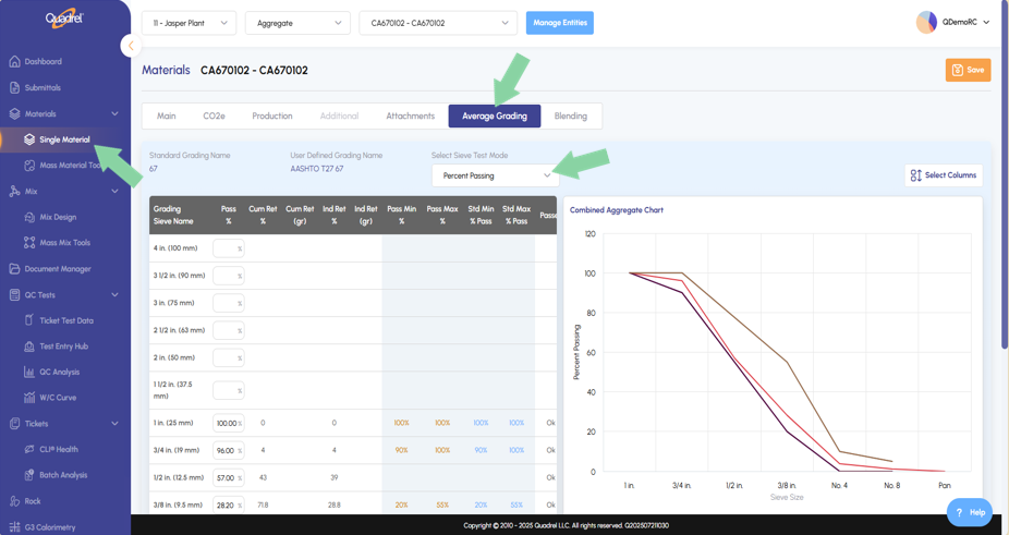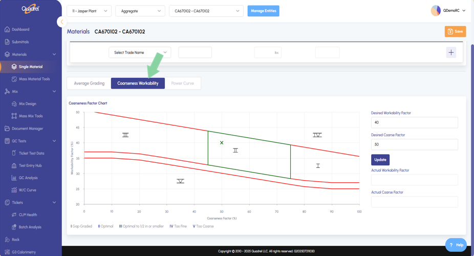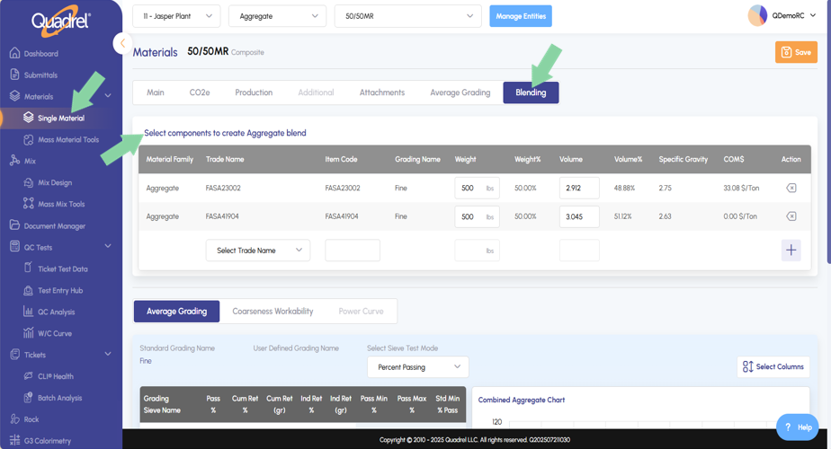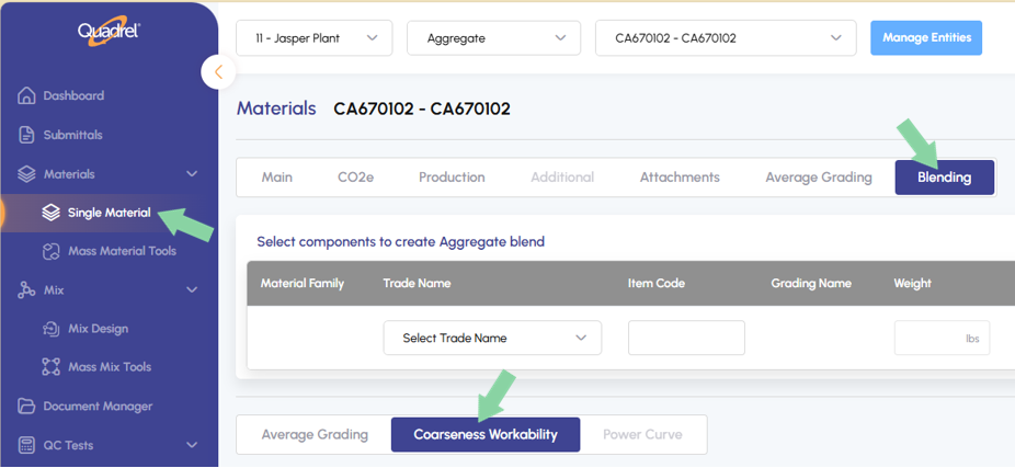 In single materials several iRock features were added into web Quadrel. Users will now see, Average Grading, Coarseness Workability, Blend Tab Aggregate, Blend Tab Cementitious Materials.