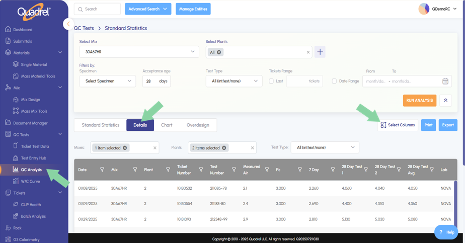 - The remaining Set Default Detail Columns from legacy Quadrel are now available in web Quadrel in the detail section of QC Analysis. Click on Select Columns from the Details tab as shown in the screenshot below.