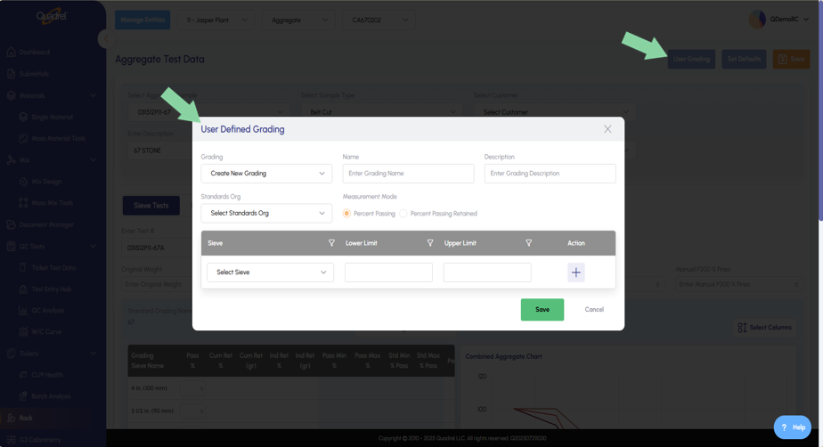 Added in new features such as User Defined Grading, Test Entry, and Default Sieve Stack. - QC Analysis