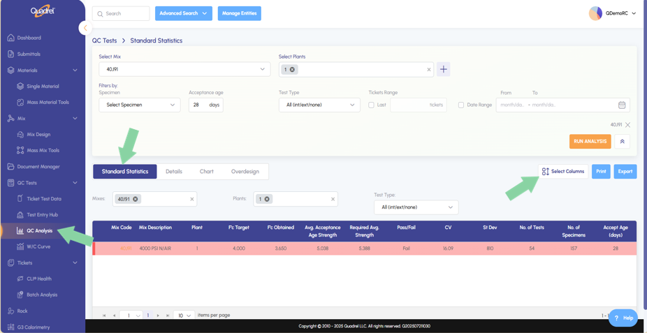 - The remaining Set Default Summary Columns from legacy Quadrel are now available in web Quadrel in the summary section of QC Analysis. Click on Select Columns from the standard statistics tab as shown in the screenshot below.