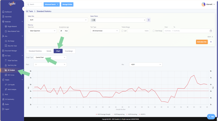 In QC Analysis control chart is now available under graph type. Additionally, users can now set default summary columns as well as default details columns. These columns were from legacy Quadrel, and now can be used in web Quadrel. - Single Material: Recycled Material