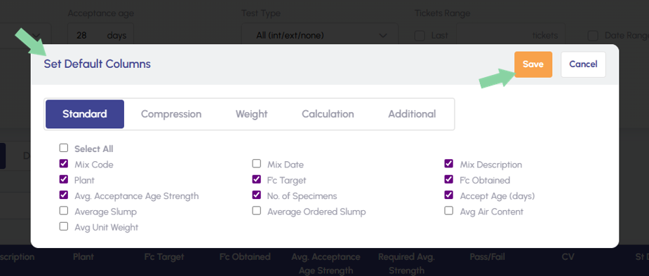 A similar set Default Columns form will open. Select the checkboxes of items you would like to see as column headers and click save to apply the changes.
