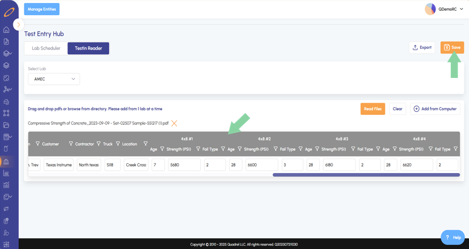 - Users will now see improvements made to the TestIn grid. The Quadrel software will now hide unused columns from current imports, reducing the number of blank columns for the user to navigate through. Additionally, the columns have been organized making it more user friendly. As example, all 4x8 cylinder test data is now grouped together, and all 6x12 cylinder test data will be grouped together.