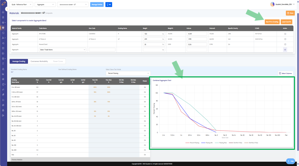 - Click the button "Best Fit to Grading" and the combined aggregate chart will generate accordingly. Showing the best fit to the user defined grading upper and lower limits.