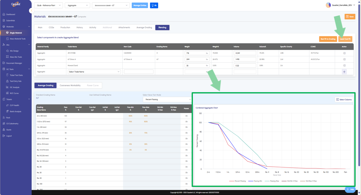 Users will now see two new buttons in the aggregate materials blending tab, Best Fit to Grading as well as Least Cost Fit. These buttons can be used to generate a corresponding chart based on user defined limits. - Single Material: Average Grading