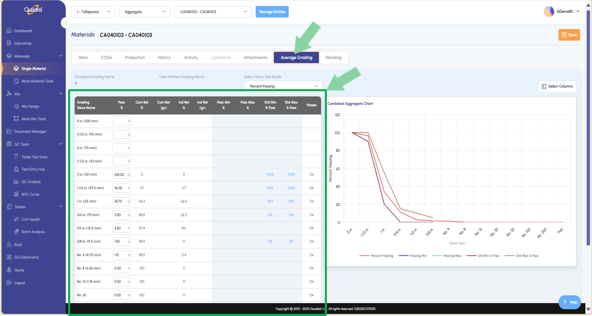 - Users can now input their average grading data for aggregate materials in web Quadrel. Be sure to click save after making changes to a materials average grading.