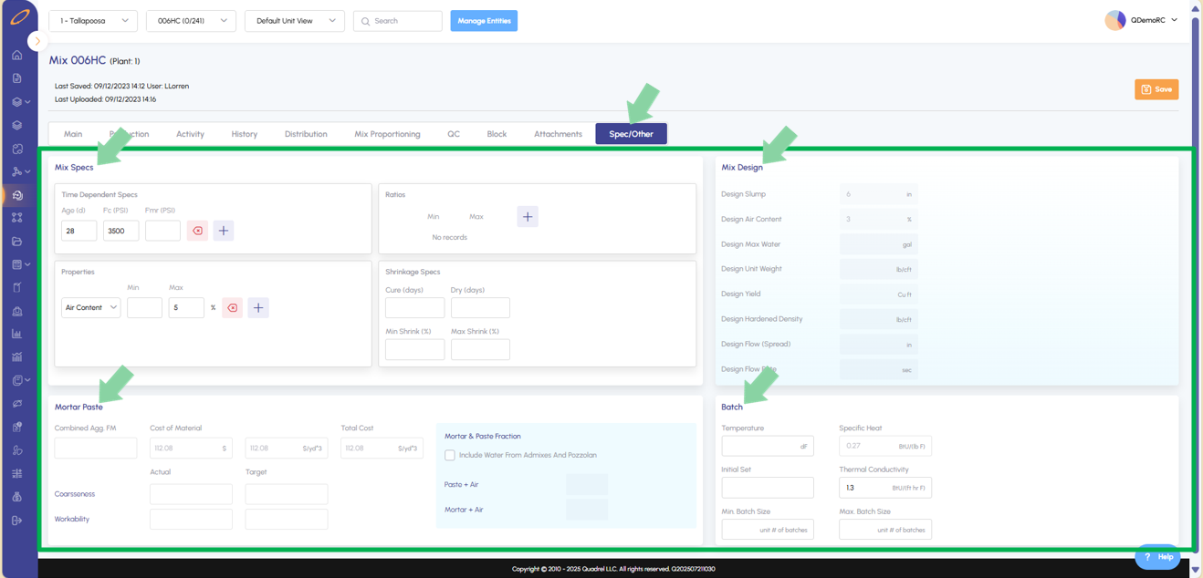 - Web Quadrel users will see a new tab in mix design labeled "Spec/Other". In this tab users will find additional features related to mix design such as.