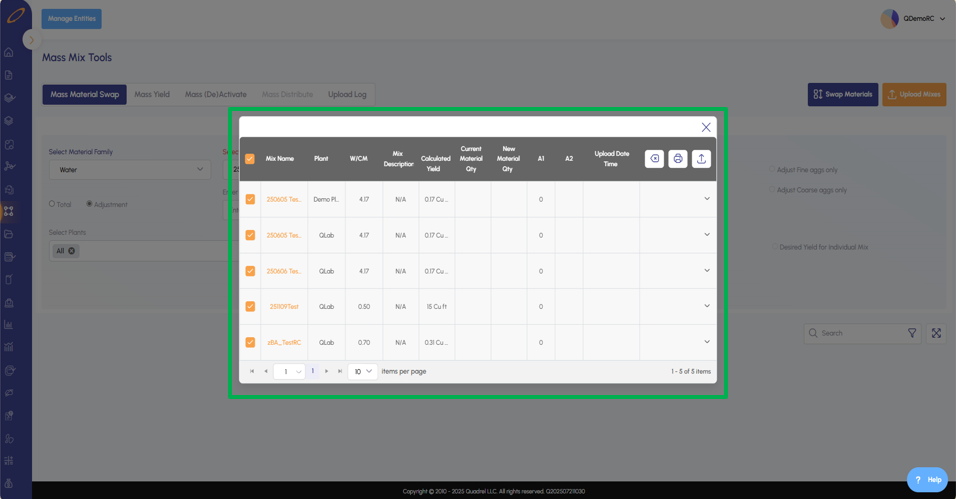 Users will now be able to upload multiple mixes at a time from the mix grid. Additionally, users can distribute mixes to new plants and have them upload at the same time. - Mix Design: Tickets and Tests Preview