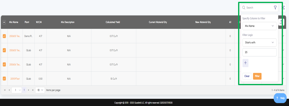 - Users can use the search box to apply custom filtering logic to the grid results as shown in the screenshot below. As example, the filter shown below is only showing mixes in the grid that have a mix name starting with "25".