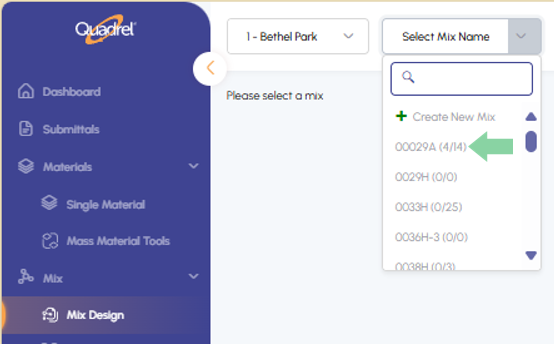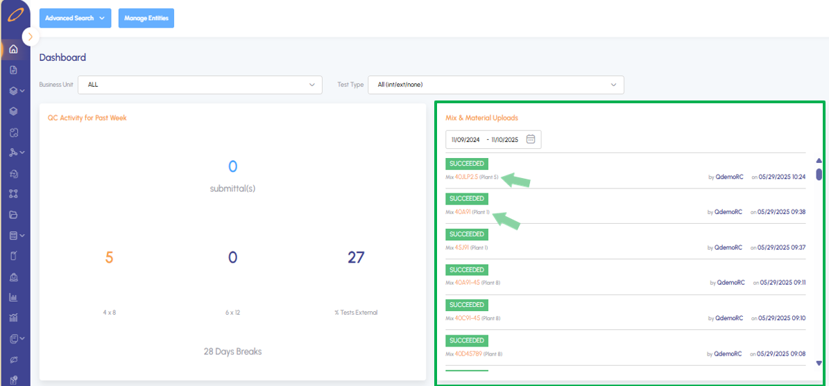 - On the QC tab of the dashboard users will see the Mix and Material Uploads tile. Besides each mix name, Quadrel now informs the user of the plant the mix comes from.
