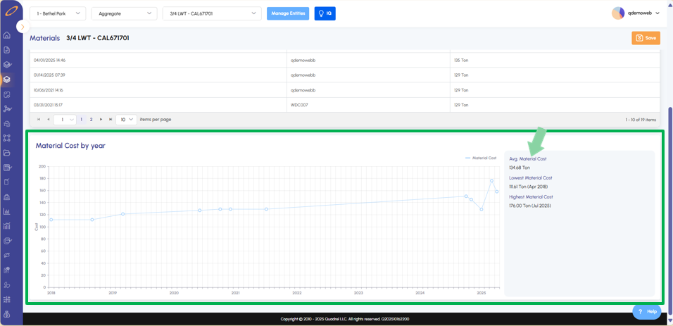 The material hub has been added to web Quadrel and can be found in the production tab of a material showing the tickets the material was in, it's % in tolerance, and $ wastage. It shows in the production tab. In the history tab users can scroll down to see material cost by year charted. Finally in the activity tab, users will be able to add comments to the material and export if desired. - Dashboard: Mix and Material Tile Shows the Plant