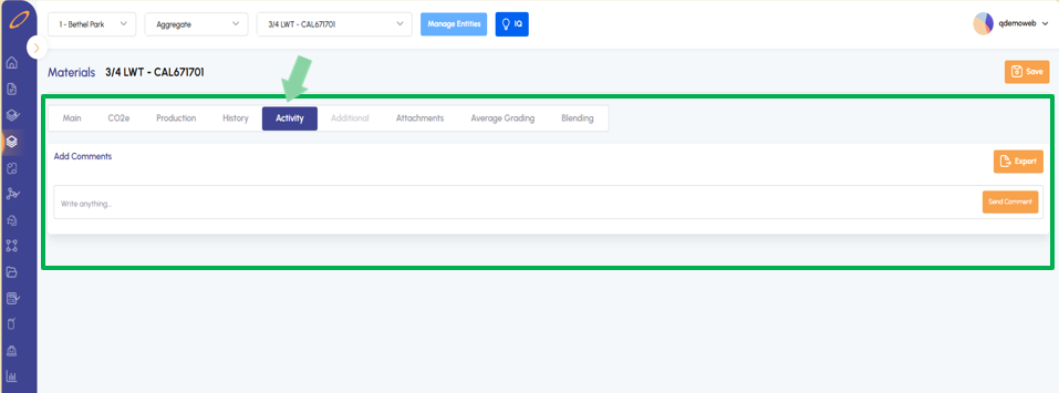 - In single material, activity tab, users will be able to add comments to the material and export if desired.