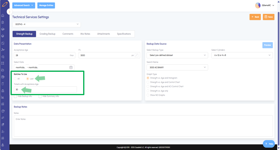 - Users in submittals who are adding strength backup data will now be able to specify the number of Batches to use in the submittal report with the specified acceptance age. In the example below, the submittal will pull in strength backup data from the last 30 batch tickets with acceptance age of 28 days.
