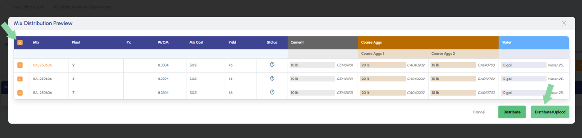 - The first update is to upload from the mix grid. From the distribution tab, select the View/Edit Mix Grid radio button and then load desired mixes. Users can select mixes checkboxes to upload them all at once to corresponding plants with a few clicks.
