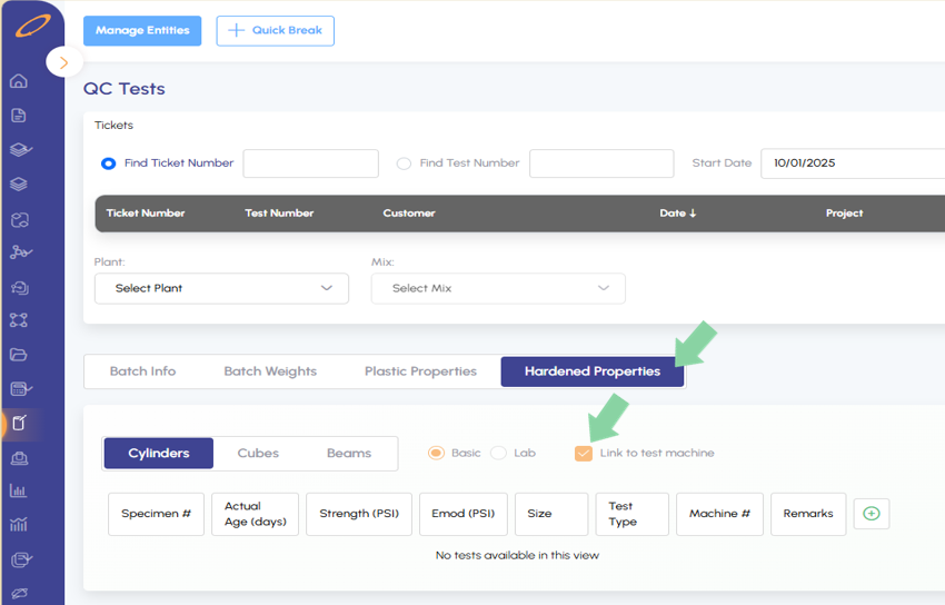 When creating batch tickets, users will notice the box "Link to Test Machine" will now be checked automatically. Please email us if you would like this option turned on. - Submittals: Technical Service Settings