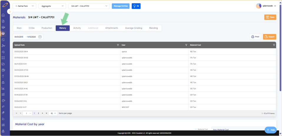 - In single material, switch to the history tab. Users can scroll down to see material cost by year charted.
