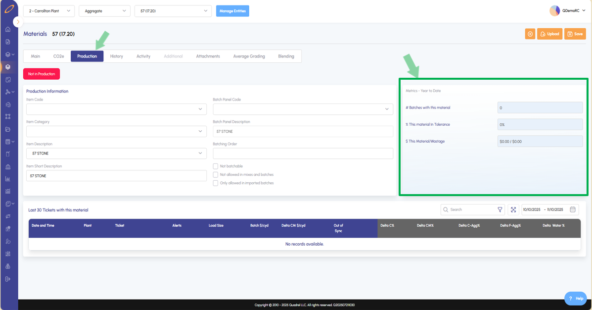 - In single material, production tab, users will see a new information tile. In this tile users will see their year-to-date Material Metrics.