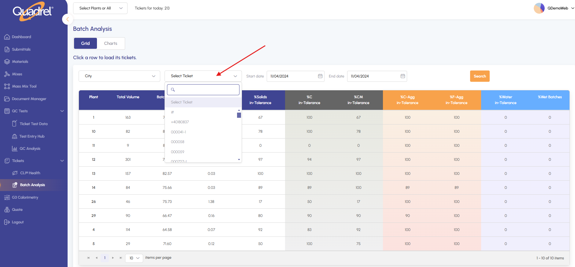 Under Batch Analysis, enter or select a ticket number in the search field.