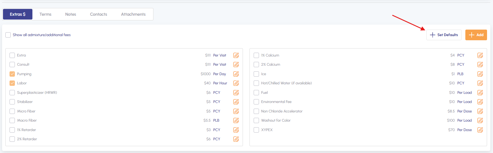 To set default extras either create a new quote or click edit icon. Under pricing tab scroll down to Extras and click "Set Defaults".