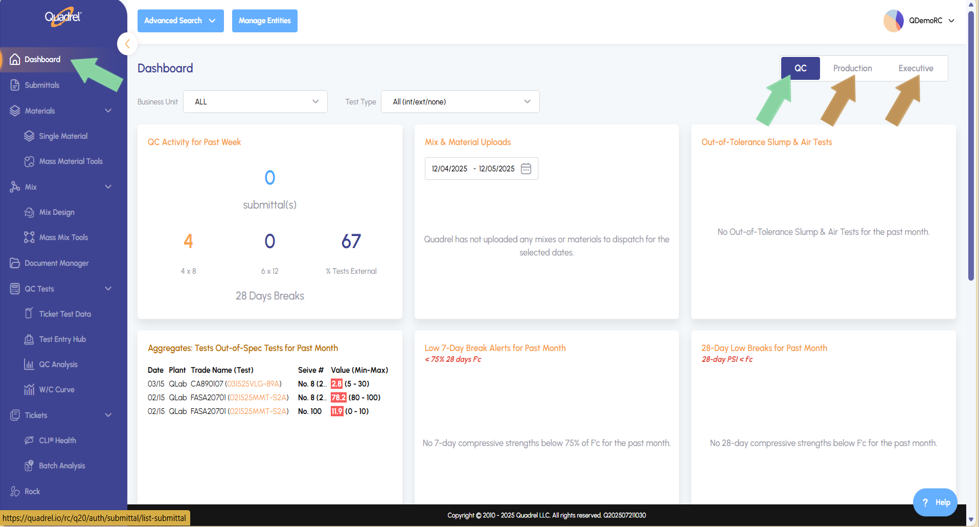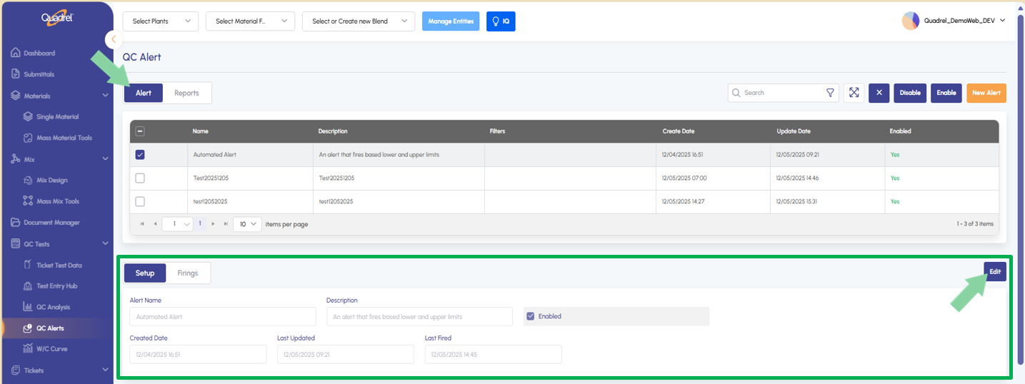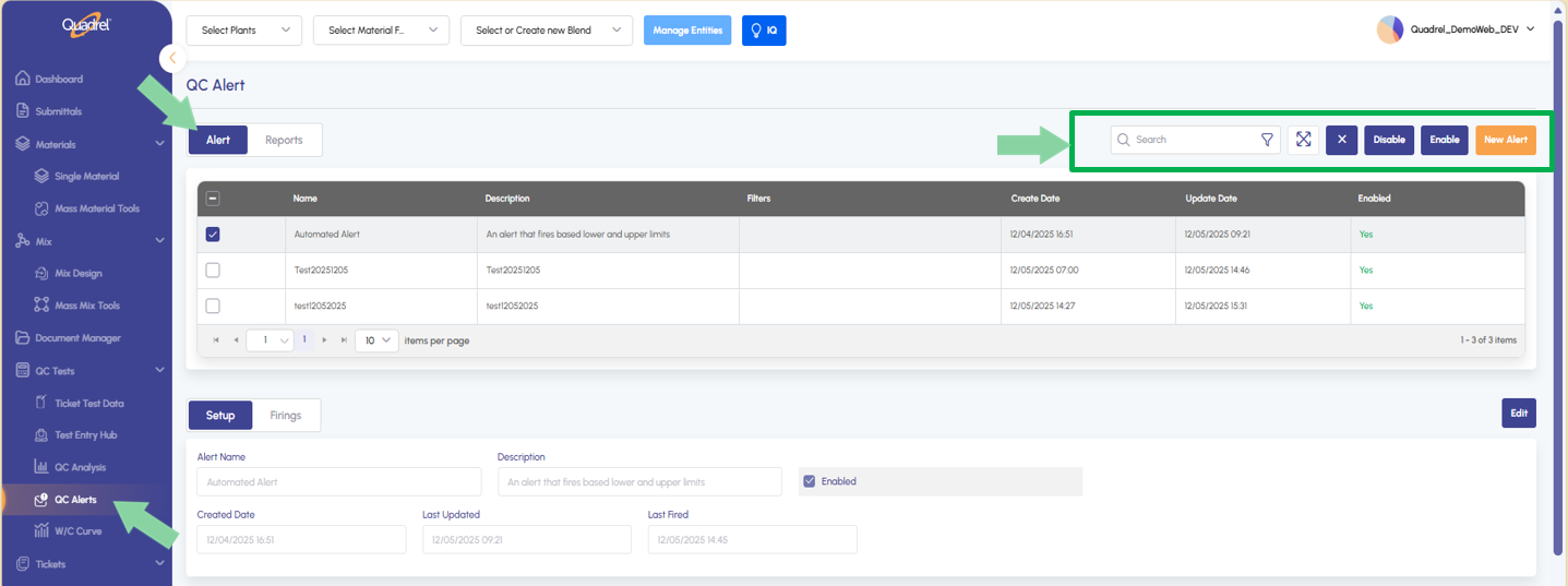 QC Test: QC Alerts Users can now create and configure fully customizable alert rules to identify when test data (air, slump, strength) falls outside desired tolerances, filter to apply to target mixes, projects, materials, etc., and specify recipients. Quadrel can automatically notify users via email whenever an alert condition is triggered.
