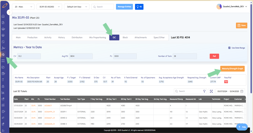 In Mix Hub, users can select a mix that has break data and then navigate to the QC tab. Users will notice a new button labeled Maturity/Strength Graph as shown in the screenshot below.