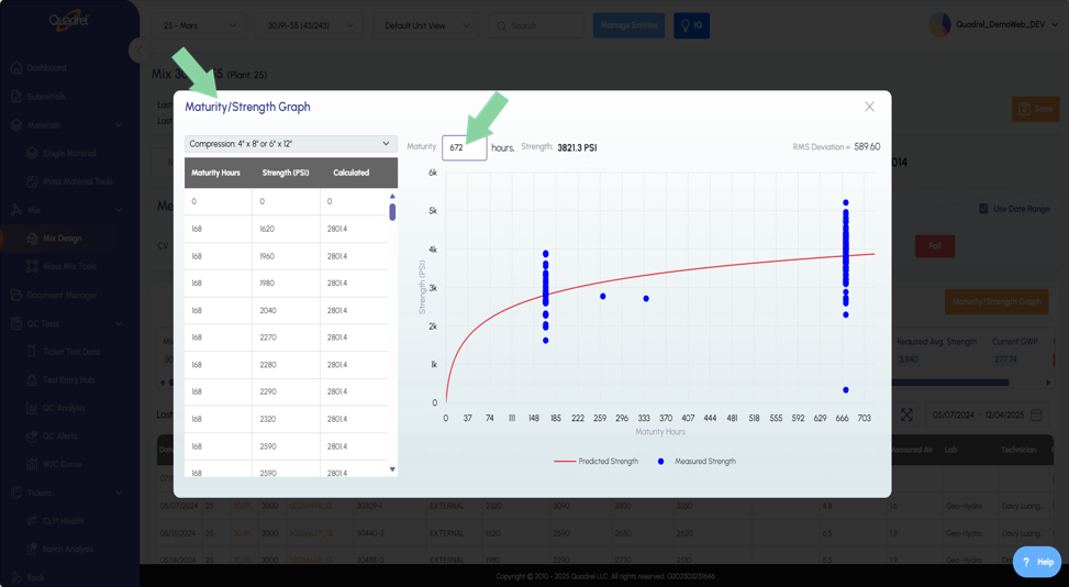 Users can enter a specific amount of maturity hours and Quadrel will return the Strength in PSI at the entered hours.