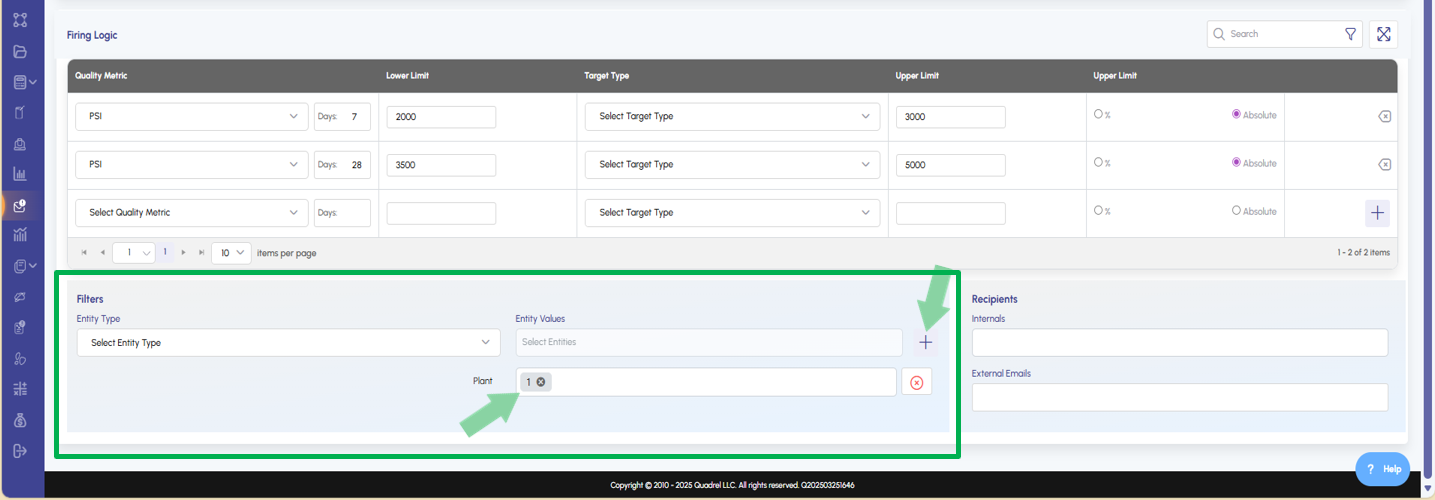 In the example below, we have added a plant 1 filter to the alert. This means only the firing logic that has its conditions met in plant 1 will produce an alert for the user.