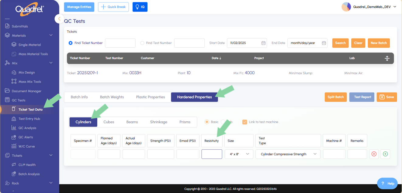 Hardened Properties Cylinders: Resistivity In both Basic and Lab modes, users can now record resistivity data for cylinders within the hardened properties section of a ticket.