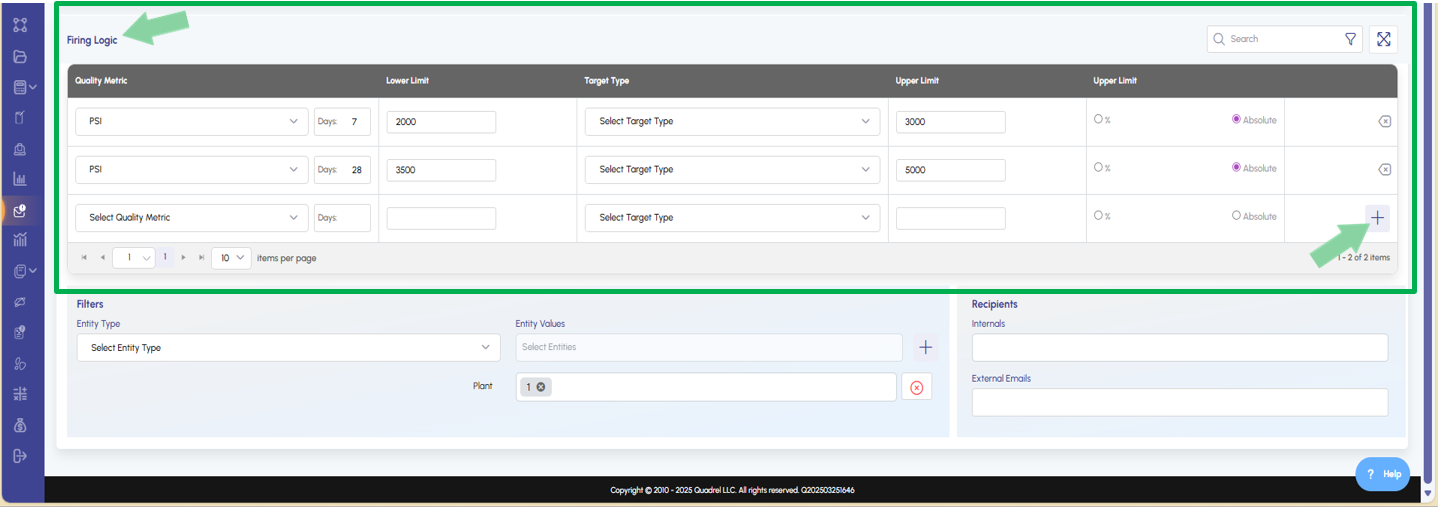 Scrolling down on the same page the next alert setup item is Firing Logic. In this table users define what conditions will trigger alerts to be sent out based on expected results and tolerances. In the example below there are two separate conditions, once you have completed filling in the information for a row, click the plus icon to apply the firing logic to this alert.
