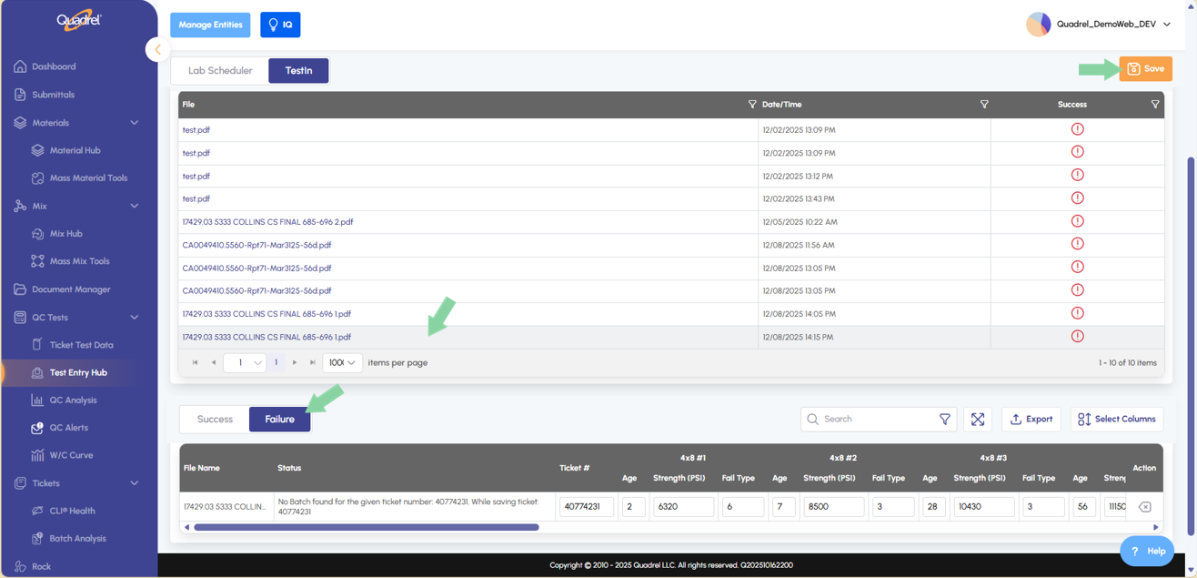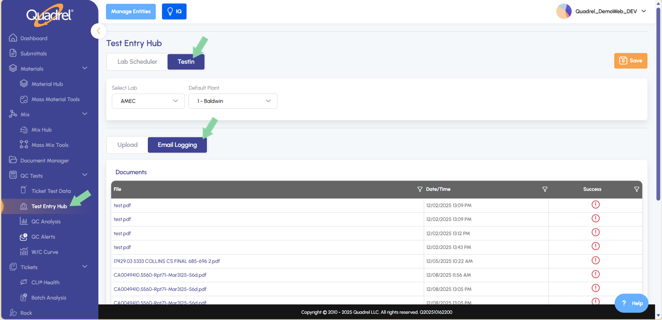 Test Data files will arrive to the document's container on the Email Logging tab. Test data files that failed to be read in will have a red icon in the Success column. Users can click on failed rows to open that ticket down below and fix what is causing failure. Be sure to save after making changes on failed rows to attempt reimporting the ticket successfully.