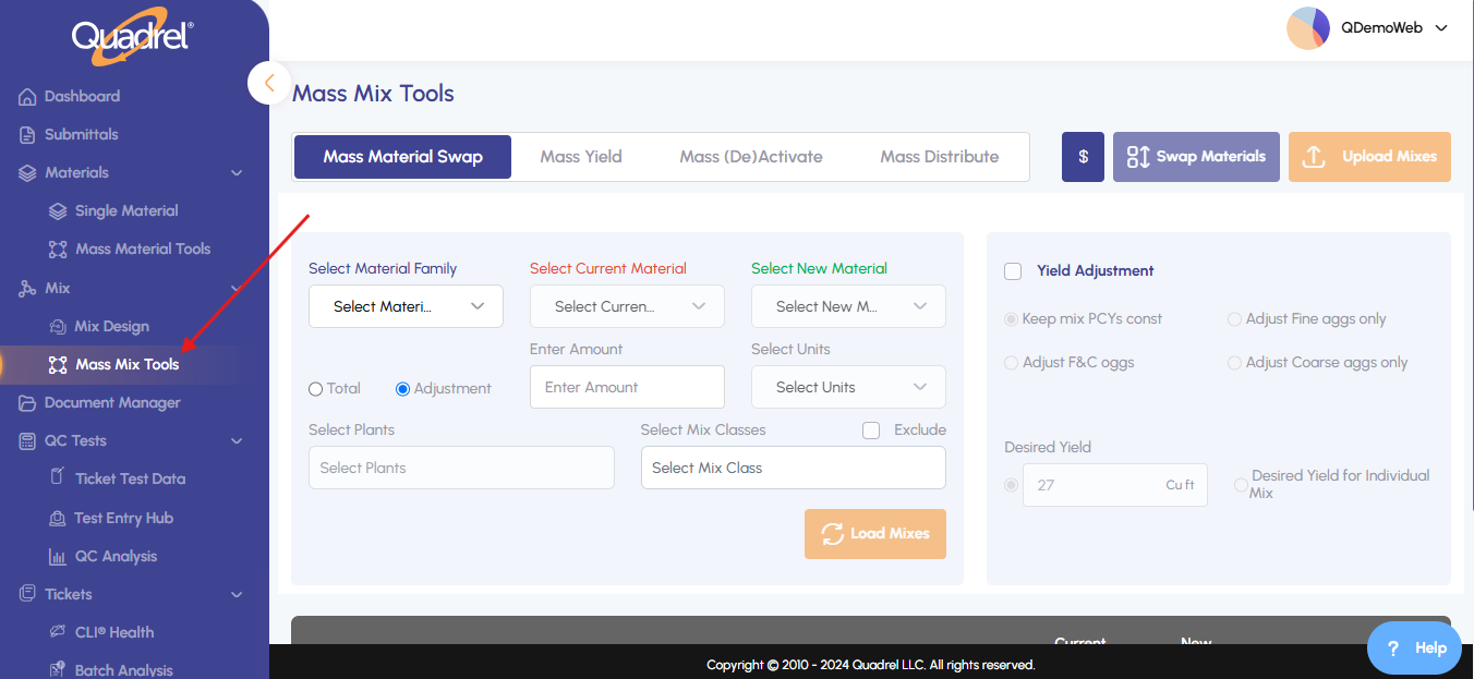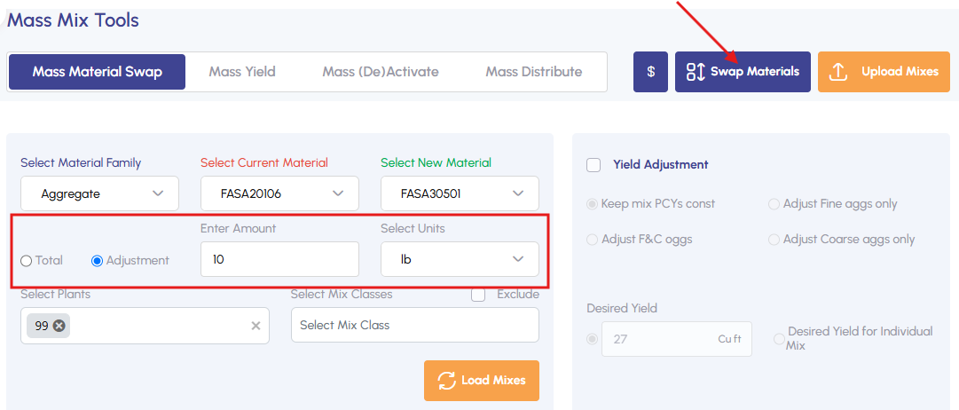 Choose the materials and plant(s), then click Load Mixes.