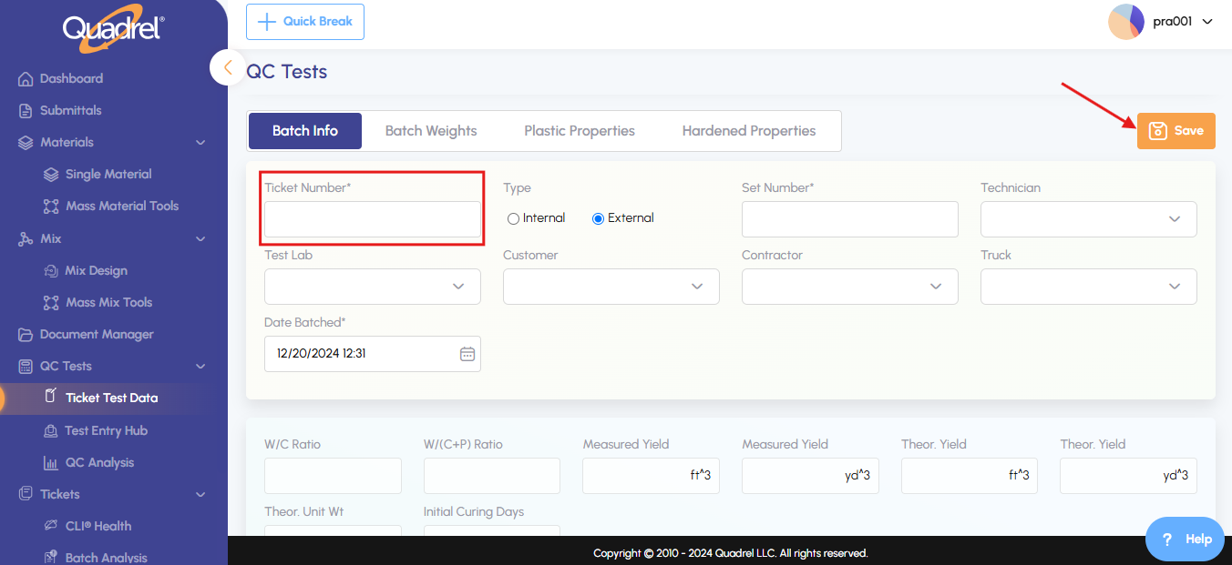 QC: Click a ticket number to view its plastic properties.