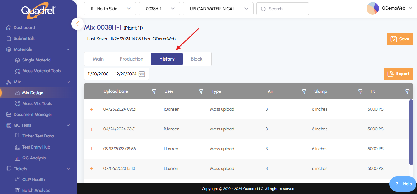 In the Mix Design menu, select a mix and click the History tab.