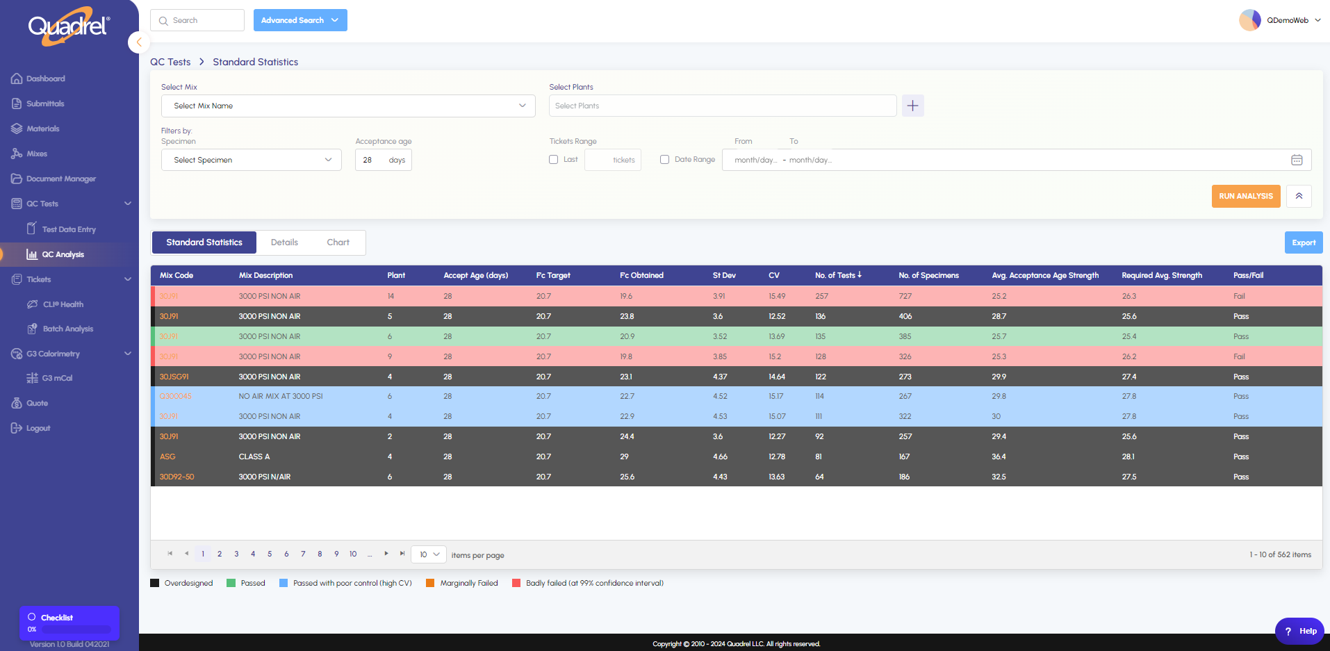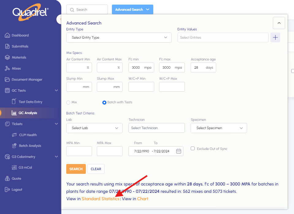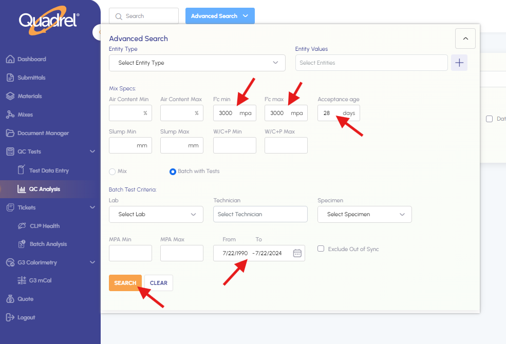 5. In the example below I selected the MIX PSI be 28 days 3000 PSI, I added a long date range, then clicked Search.